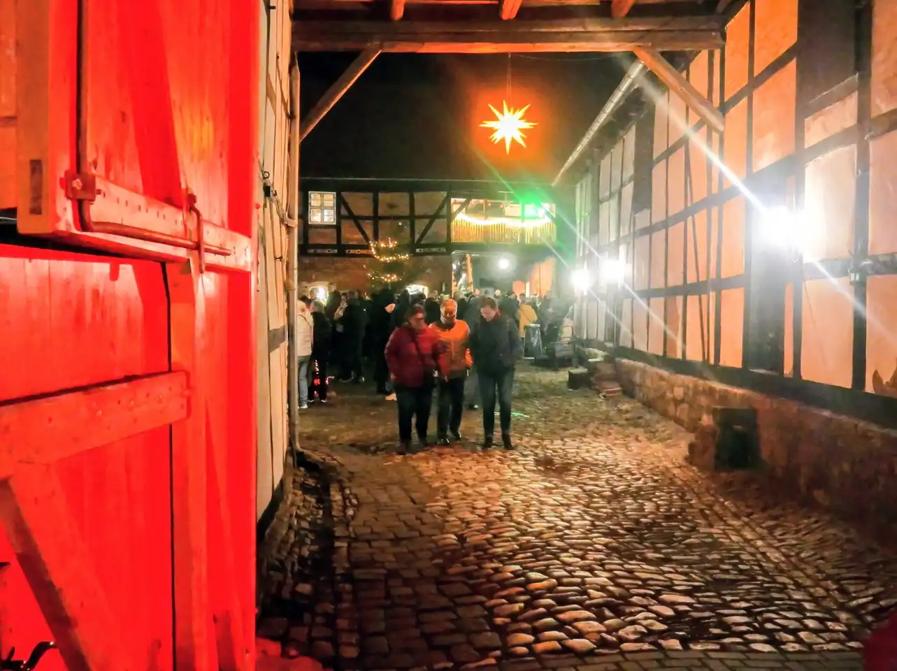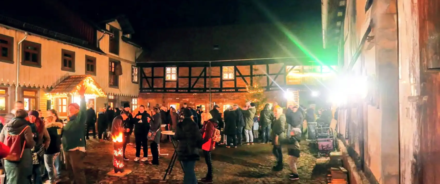 Mit Ein­bruch der Däm­me­rung tauch­ten Schein­wer­fer und unzäh­li­ge Lich­ter den Vier­seit­hof in far­bi­ges Leuch­ten und sorg­ten für ech­te Vor­ad­vents-Atmo­sphä­re.