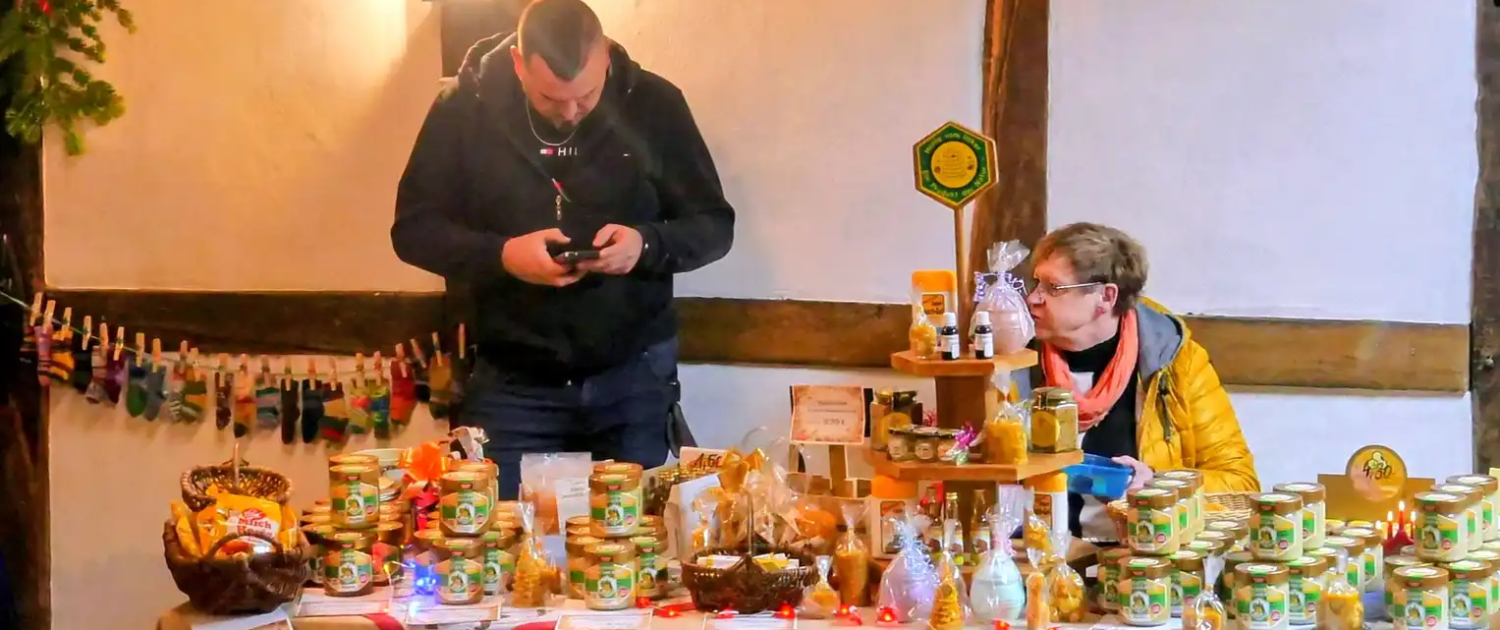 Mit Span­nung erwar­tet wur­de der frisch gestal­te­te Raum im Ober­ge­schoss – der Papier­bo­den. Dort fan­den sich wie jedes Jahr treue Stamm­gäs­te ein, auf der Suche nach Woll­so­cken, Honig­pro­duk­ten und weih­nacht­li­chen Acces­soires.