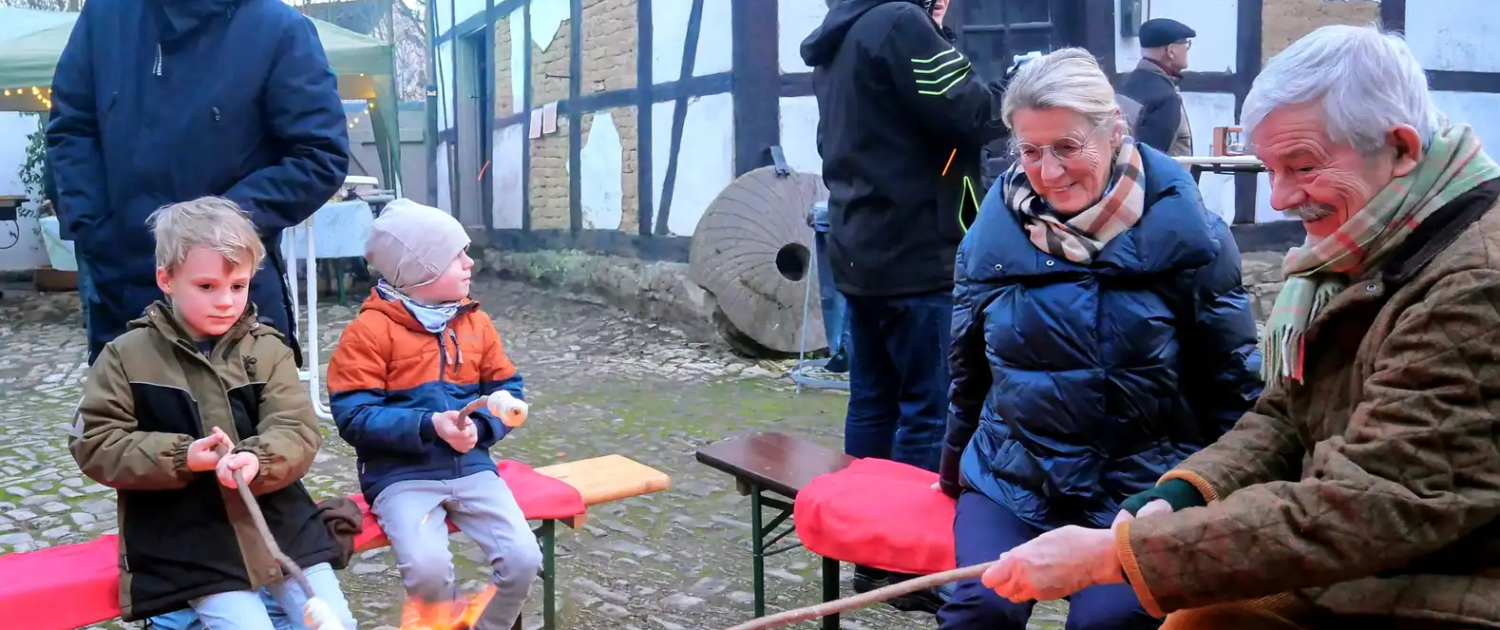 Beson­ders die jüngs­ten Gäs­te konn­ten es kaum erwar­ten : Rund um die Feu­er­stel­le rös­te­ten sie Stock­brot, bewaff­net mit ihren „Räb­ker Spee­ren“. Wäh­rend­des­sen füll­te sich der Hof zuse­hends – Besu­cher aus Räb­ke und Umge­bung ström­ten her­bei.