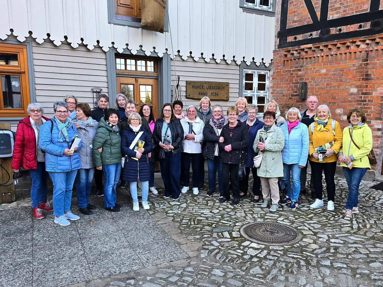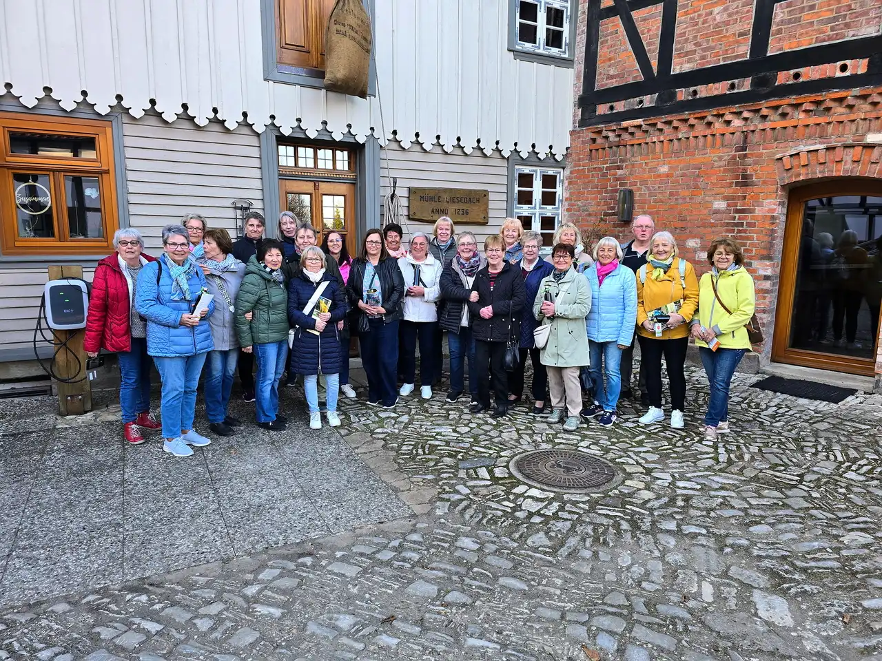 Die­ses Frei­tag­ereig­nis war die drit­te Ver­an­stal­tung im Kalen­der­jahr : Der Ver­ein durf­te die Damen­grup­pe II des SV Emmer­stedt 1919 e. V. begrü­ßen. Eine fröh­li­che Gym­nas­tik­grup­pe traf pünkt­lich zur Kaf­fee­zeit im 7‑Müh­len-Dorf ein. Bei die­sem Besuch kam die Rede­wen­dung „Wer zuerst kommt, mahlt zuerst“ zur Anwen­dung. Ursprüng­lich in alten Müh­len­be­trie­ben behei­ma­tet, zog der Aus­spruch an die­sem Tag eine Par­al­le­le – denn am glei­chen Tag stand auch eine ande­re gro­ße Grup­pe vor der Absicht, die Müh­le zu besich­ti­gen.