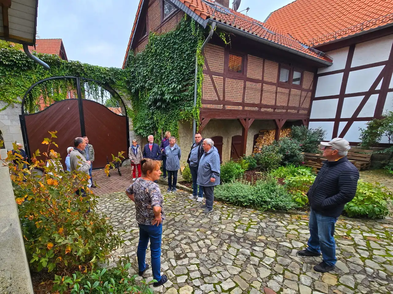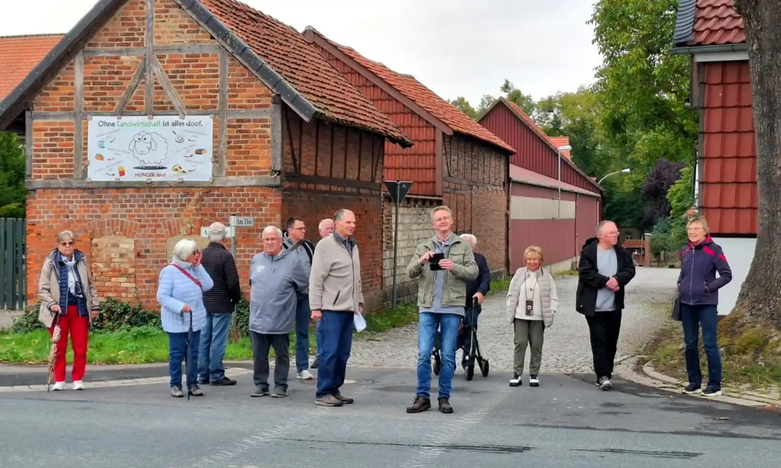 Im Anschluss führ­te eine Dorf­run­de durch die Armen Rei­he und die Schul­stra­ße in Rich­tung Thie. An mar­kan­ten Sta­tio­nen – wie der Hof­an­la­ge von Inge Buch­holtz und dem tra­di­ti­ons­rei­chen Thie­platz – erfuh­ren die Gäs­te von Chris­ti­an Lub­ko­witz span­nen­de Details aus Ver­gan­gen­heit und Gegen­wart des Ortes. Umkehr­punkt war am Was­ser­er­leb­nis­platz, wo das Zusam­men­spiel von Natur, Was­ser und Tech­nik ein­drucks­voll sicht­bar wird, von dort ging es zur Müh­le zurück..